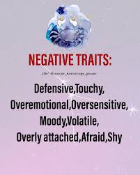 Cancers, like all of the zodiac signs, have positive and negative character traits. Cancerians are often known to have a moody attitude, especially when they are jealous. Cancer woman negative personality traits. On the flip side, you are changeable and moody, overly emotional and touchy, clinging and unable to let go. A cancer can hold a grudge their entire life.
