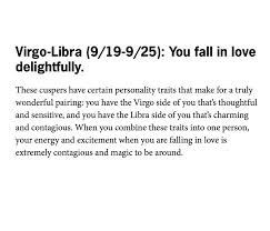 Hello, i was born on june 11th, 92 and for most of my life always seem to relate 75% to the cancer zodiac and 25% gemini. Virgo libra cuspers and taurus is an interesting combofacebookfacebook.com/tipsypsychictwitter@tipsypsychicsnapchatzoethepsychicinstagram@tipsypsychic The typical libra sign can get along with most other people. The dates for sun signs (often miscalled your zodiac sign) vary with the year, the time of birth, the place of birth. When they fall in love, it's in the long run. Sounds like a pretty delightful combination, right? What is a virgo libra cusp compatible with? When it comes to houses of a chart, there is a meaning for the cusp, but with signs, one is on one side or the other. So since you are not sure if sun was moving through virgo or libra at the time you were born, scammer say you are on the cusp. When libra and virgo come together, it's all about what is pleasing—in every permutation of the word. The cusp between virgo and libra happens at a precise moment, which varies from year to year.if you were born before it you would be virgo, and after it you would be libra. Virgo is an earth sign ruled by mercury, relying highly on their intellect, while bringing venus to its fall. The cusp of virgo and libra is actually compatible with the cusp of aries and taurusfacebookfacebook.com/tipsypsychictwitter@tipsypsyc.